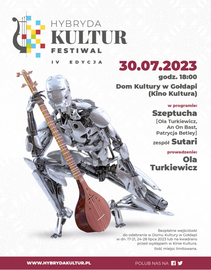W trzeciej edycji wydarzenia zobaczymy na scenie Olę Turkiewicz z projektem „Autochtonka” oraz zespoły T/Aboret, Dziczka i Dikanda. Hybryda Kultur otworzy 3-dniowy cykl wydarzeń poprzedzając VIII Projekt Arboretum „Gołdapś” połączony z warsztatami tańca tradycyjnego i Potańcówką Ludową (31 lipca 2022 g.16:00 – 21:00) oraz Koncert Niepodległości „Za Naszą i Waszą Wolność” (1 sierpnia 2022 g.18:00)