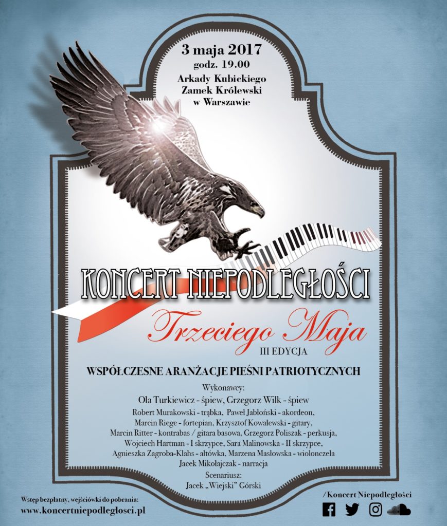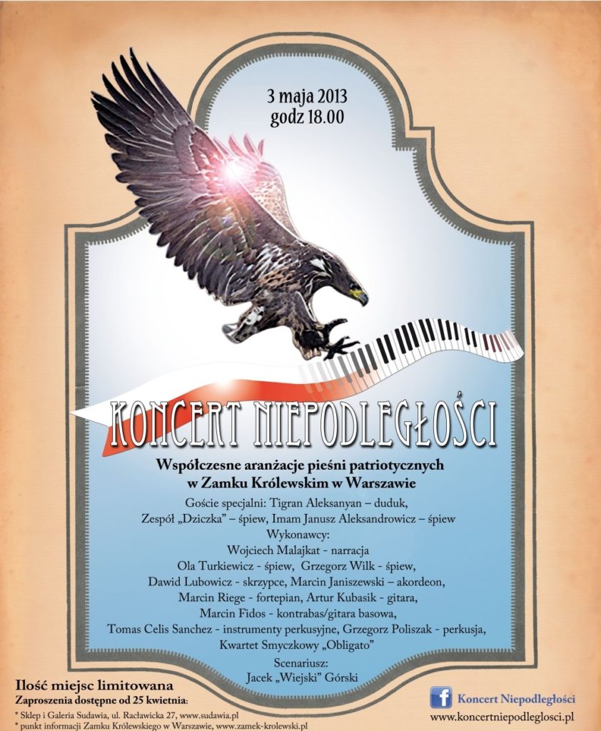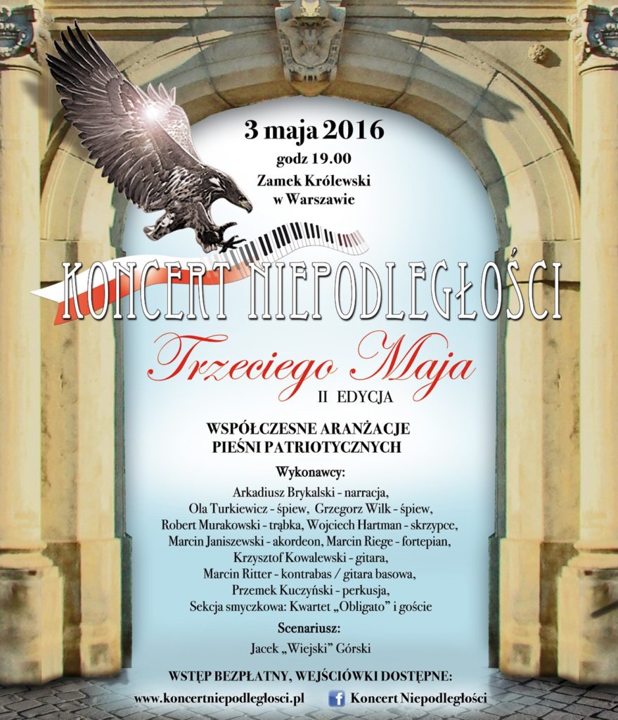 W roku 2013, odbyła się premiera Koncertu Niepodległości Trzeciego Maja na Zamku Królewskim w Warszawie. W koncercie postanowiliśmy ukazać m.in. fenomen Polski Jagiellonów, kraju wielu kultur i narodowości, gdzie pokojowo współistniały największe religie świata. Tej radosnej rocznicy poświęcona została współczesna aranżacja mało znanego utworu „Polonez trzeciego maja” (1791 r.)