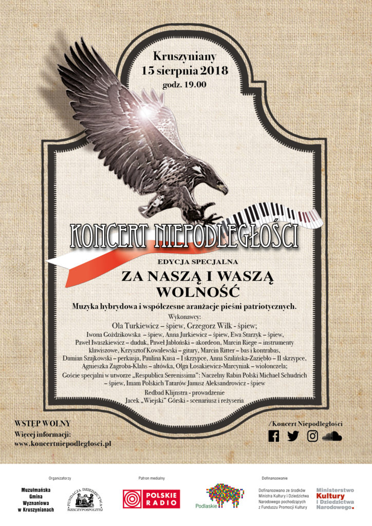 Koncert dedykowany jest cudzoziemcom oraz mniejszościom narodowym i wyznaniowym, walczącym o Rzeczpospolitą. Symbolikę wydarzenia dopełni otoczenie malowniczej tatarskiej wsi, mizaru i zabytkowego meczetu polskich Tatarów, którzy są nierozerwalnie złączeni z historią polskiego oręża, począwszy od bitwy pod Grunwaldem. Zapraszamy 15 sierpnia 2018 do Kruszynian na Podlasie.