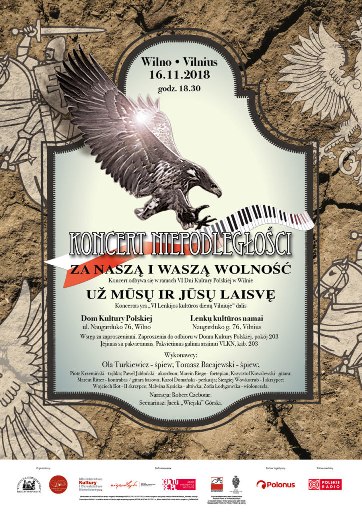 Dedykowana Polakom mieszkającym poza granicami kraju oraz Polonii edycja Koncertu Niepodległości opowiadająca dzieje Polaków walczących o wolność innych narodów ze szczególnym uwzględnieniem wspólnoty Polaków i Litwinów od czasów Unii w Krewie aż po braterstwo broni podczas Powstania Listopadowego i Styczniowego. Koncert odbędzie się 16 listopada w Wilnie.