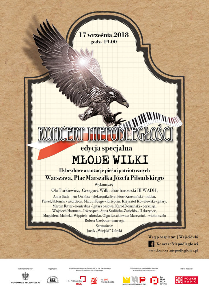 Inspiracją koncertu „Młode Wilki” są słowa „Obławy” autorstwa Jacka Kaczmarskiego. Realizowana, w 79 rocznicę sowieckiej agresji na Polskę, specjalna edycja Koncert Niepodległości, dedykowana jest młodzieży polskich kresów, która czynnie stawiła opór Armii Czerwonej we wrześniu 1939 roku. Zapraszamy 17 września 2018 na Plac Marszałka Józefa Piłsudskiego, Warszawa.