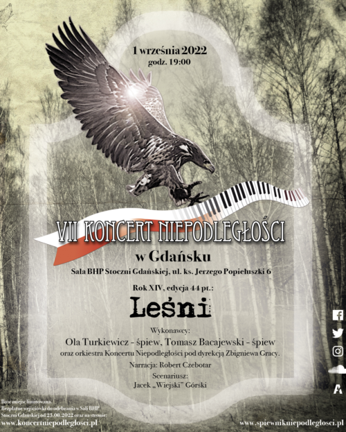 Koncert Niepodległości w Gdańsku, edycja „Leśni” zaprezentuje historię Polski widzianą poprzez pryzmat wojen podjazdowych, zmagań konfederackich i walk partyzanckich począwszy od 1109 roku aż po lata 80. ubiegłego wieku. W programie znajdą się jedne z najlepszych utworów z dorobku Koncertu Niepodległości.