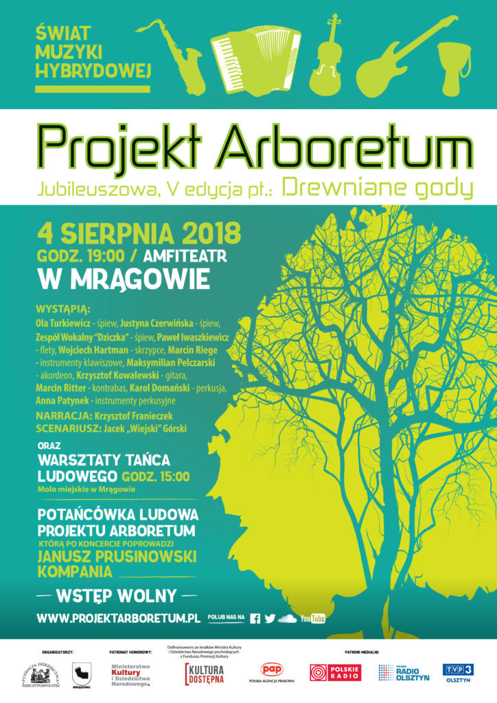4 sierpnia 2018 roku o godz. 19.00, w Amfiteatrze nad jeziorem Czos w Mrągowie, odbędzie się jubileuszowy, V Projekt Arboretum pt. „Drewniane Gody”. Na repertuar koncertu składają się współczesne, multi-instrumentalne aranżacje pieśni tradycyjnych oraz autorskie kompozycje współczesne. Muzyce towarzyszyć będą opowieści ukazujące życie codzienne mieszkańców dawnej wsi.