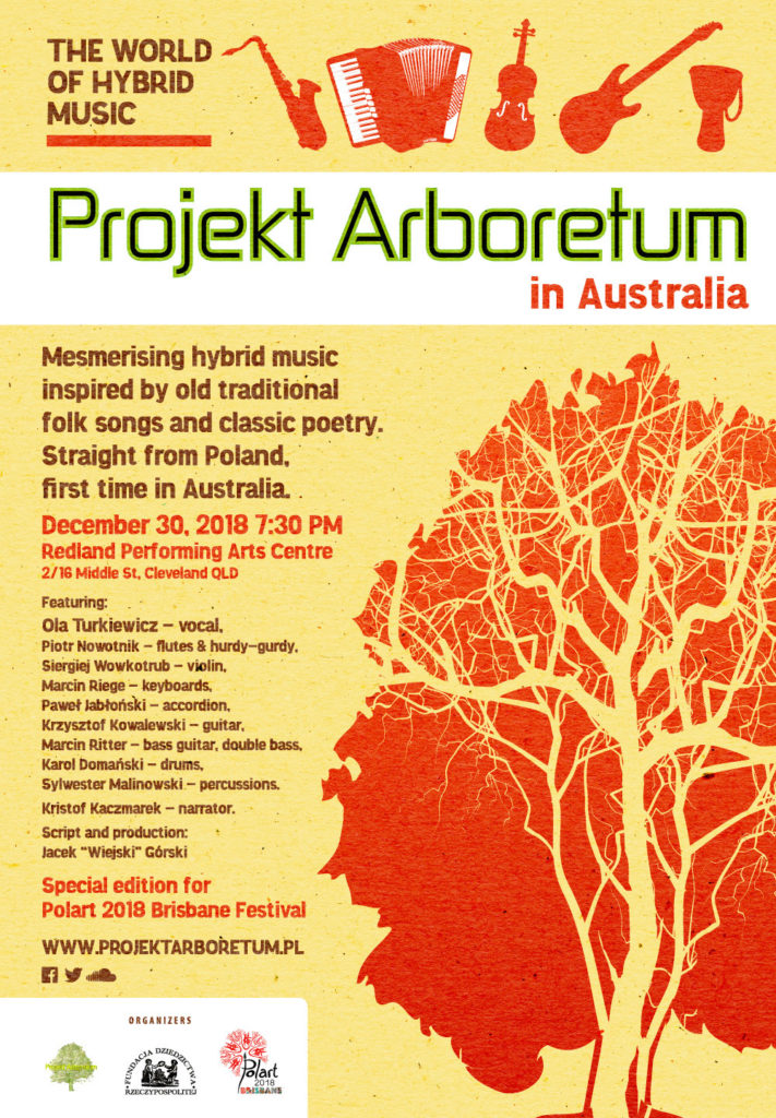 Premiera Projektu Arboretum za oceanem w Australii w ramach PolArt Festival 2018. Na repertuar koncertu składają się współczesne, multi-instrumentalne aranżacje pieśni tradycyjnych oraz autorskie kompozycje współczesne. Muzyce towarzyszyć będą opowieści ukazujące życie codzienne mieszkańców dawnej wsi. Zapraszamy 28 grudnia 2018 r. do Brisbane w Australii.