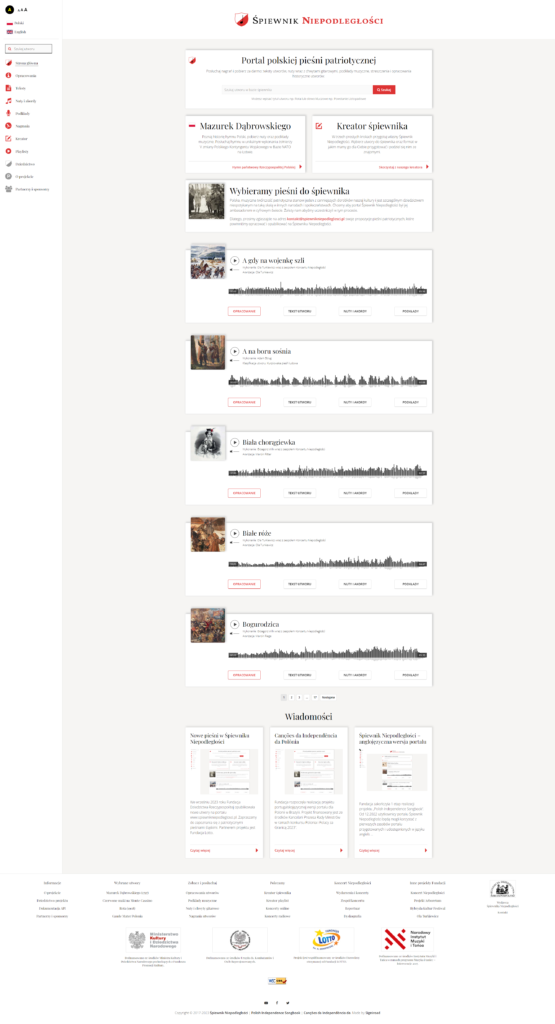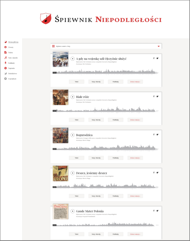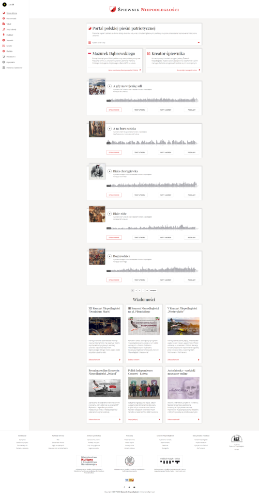 Wraz z końcem 2020 r. zakończony został kolejny etap rozbudowy technologicznej portalu Śpiewnik Niepodległości. Serwis zyskał nowe funkcjonalności m.in. playlisty, moduły rekomendacji i polecane treści oraz udostępnianie treści w social media. Opracowaliśmy i opublikowaliśmy także nowe utwory wraz z materiałami dydaktycznymi.