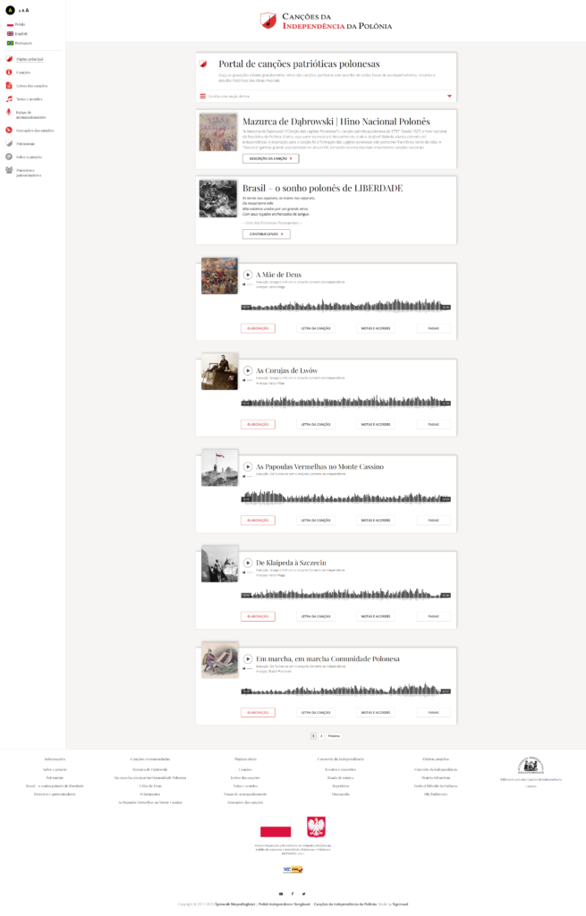 Fundacja uruchomiła Canções da Independência da Polônia, czyli portugalskojęzyczną wersję portalu Śpiewnik Niepodległości dedykowaną Polonii w Brazylii. Realizacja projektu „Specjalna odsłona portalu polskiej pieśni patriotycznej Śpiewnik Niepodległości dla Polonii w Brazylii” była możliwa dzięki dofinansowaniu ze środków Kancelarii Prezesa Rady Ministrów w ramach konkursu Polonia i Polacy za Granicą 2023”.